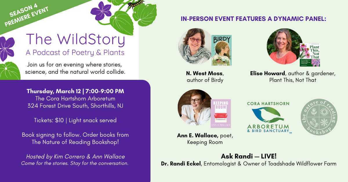 | Episode 28 is now available on Spotify, Apple, Google, and Amazon Listen Here! The WildStory: A Podcast of Poetry and Plants by the Native Plant Society of New Jersey Share this podcast with your friends and family. The Wildstory is a FREE resource to learn from and available to everyone! Hosted by Ann E. Wallace, PhD Poet Laureate Emeritus of Jersey City Co-host Kim Correro Rutgers Master Gardener and Director of State Programs Special Contributor Dr. Randi Eckel Entomologist and Vice President of Membership NPSNJ Do you have a question about native plants for Randi? Email: TheWildStory@npsnj.org Welcome to Season 4 of the WildStory! We have a wonderful, jam-packed season opener, and we hope you enjoy all that we have in store for you this episode! To open, Award winning poet James Crews (0:3:15), author of the forthcoming book Breathing Room (Battenkill Books, March 17th), and our featured poet in Episode 19, is back! This time as our guest host, speaking with Ann E. Wallace about her new poetry collection Keeping Room, out this month from Nixes Mate Books. James and Ann have a lovely conversation about holding space—for pain and disruption, but also nature, love, and unexpected joy. In Ask Randi, Randi Eckel (0:28:47), owner of Toadshade Wildflower Farm, spills some inside details about the NPSNJ Annual Meeting on March 7th—and trust us, you won’t want to miss what she’s teasing. Then she jumps into listener questions, breaking down the mysteries of native seed stratification. We’re joined by Samuel Pott (0:39:27), Founding Artistic Director of Nimbus Dance, to explore ANIMA, a powerful new trilogy confronting environmental crisis and reimagining our place in the natural world. There will be a special performance on Friday, February 27, at 8 pm at the Bickford Theatre at the Morris Museum in Morristown, New Jersey. We catch up with N. West Moss (0:49:51) to talk about her new middle-grade novel Birdy (Christy Ottaviano Books/Little, Brown, Feb. 17), the story of an 11-year-old girl who, after her mother’s death, spends a summer in the country where the natural world helps her protect her little brother, heal her grief, and discover that family and belonging can take root in unexpected places. We wrap the episode with legendary ecological landscape designer Larry Weaner (1:14:47), founder of Larry Weaner Landscape Associates and New Directions in the American Landscape (NDAL) and keynote speaker for NPSNJ’s Planning for the Unplanned, where ecological restoration meets bold landscape design. Questions: Email Thewildstory@npsnj.org ![]() Nimbus Dance Company ANIMA: Patch of Turf Original music by Qasim Naqvi Choreography and Costumes by Samual Pott Next performance: Friday, February 27, at 8 pm at the Bickford Theatre at the Morris Museum in Morristown, New Jersey. ![]() ;![]() The Wildstory Season 4 In Person Event! Join us by the cozy for an evening where stories, science, and the natural world collide. Cora Hartshorn Arboretum 324 Forest Drive South Shorthills, NJ Tuesday, March 12th 7:00 pm – 9:00 pm Register for here! |